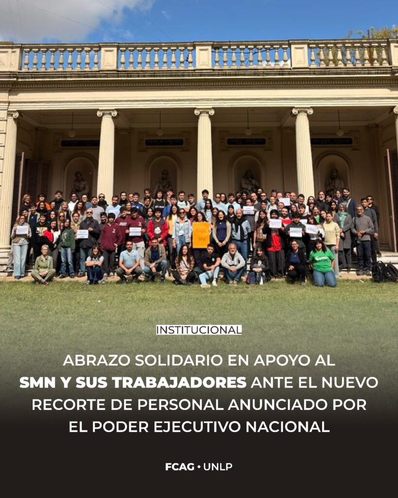El jueves 9 de abril se realizó en la FCAG un abrazo solidario simbólico en apoyo al Servicio Meteorológico Nacional ante el nuevo recorte de personal anunciado por el Poder Ejecutivo Nacional. Mas unidos que nunca,✨observar hoy, para proteger el mañana✨